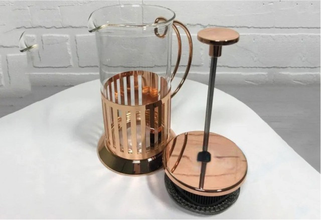 🌸 Френч-прес "Рожеве золото" об'ємом 350 мл - це чудовий інструмент для приготування кави або чаю та стильний аксесуар для вашої кухні. Його елегантний дизайн у рожево-золотистих відтінках привертає увагу та додає шарму при заварюванні напоїв.