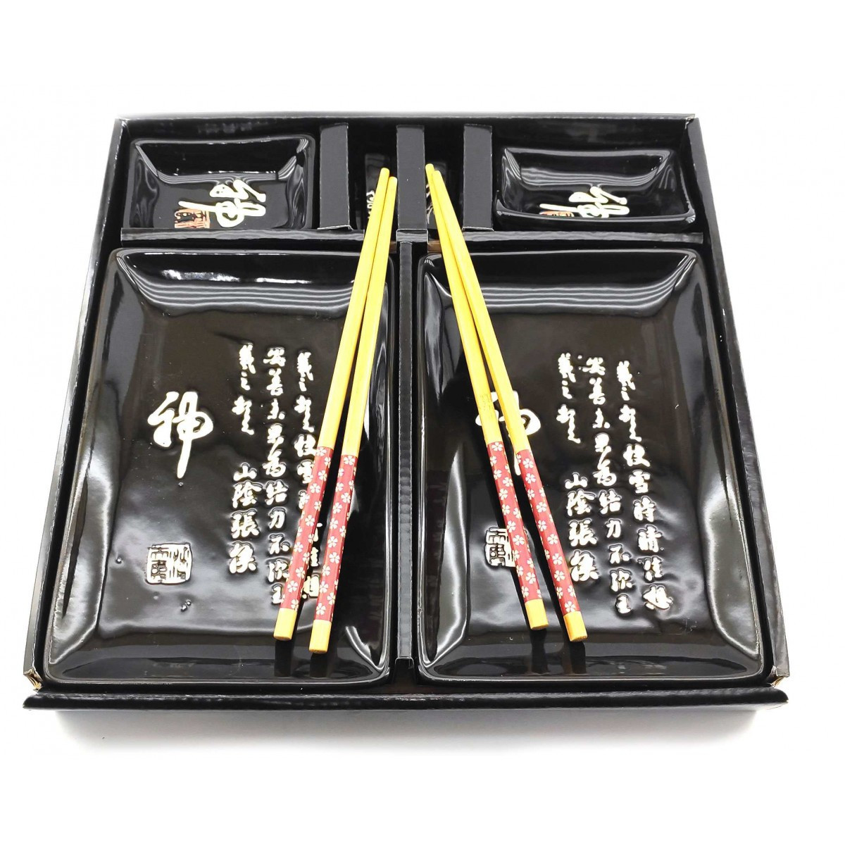 Дві керамічні прямокутні тарілки: З розміром 28х28,3х3,5 см, ці тарілки ідеально підходять для подачі різних видів суші та ролів. Їхній дизайн з ієрогліфами на чорному фоні створює атмосферу японської естетики на вашому столі.